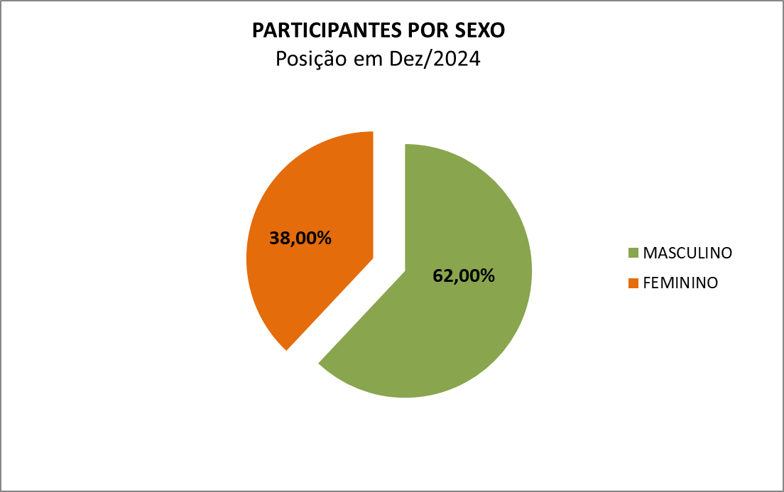 Informamos a seguir o perfil dos Participantes e Assistidos do ALEPEPREV por faixa etária e por sexo. Do total de 183 Participantes e Assistidos do Plano, podemos constatar que 5,46% encontram-se na faixa etária de 24 a 34 anos, 43,17% estão na faixa etária de 35 a 54 anos, 28,97% na faixa etária de 55 a 64 anos e 22,40% na faixa etária de 65 a 85 anos.