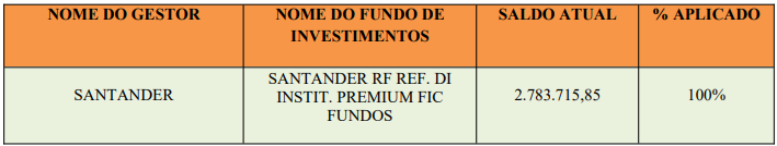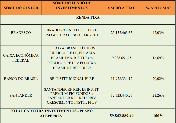 A Renda Fixa da Entidade é segmentada em quatro gestores, a saber: Caixa Econômica Federal, Bradesco, Banco do Brasil e Santander. Os recursos do segmento de Renda Fixa estão aplicados predominantemente em títulos públicos federais que são considerados como de menor risco de crédito do mercado.