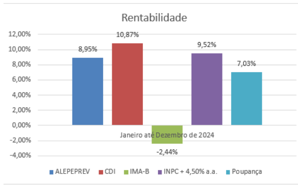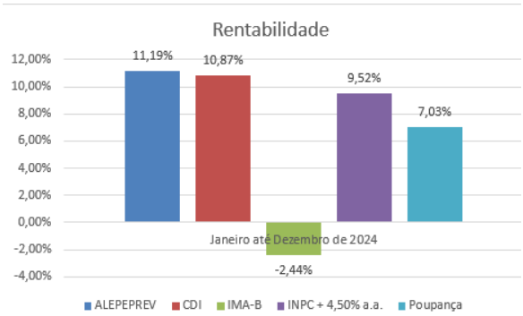 O Plano de Benefícios do ALEPEPREV obteve em 2024 um retorno de 8,95%, contra 10,87% da taxa CDI e 7,03% da Poupança, não conseguiu superar a sua meta de investimentos definida pela Política de Investimentos (INPC + 4,5% ao ano) cujo resultado foi de 9,52%.