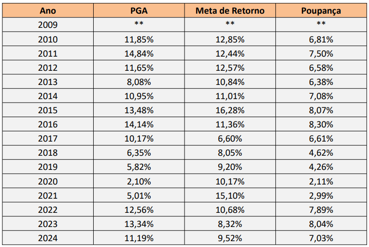 Rentabilidade Anual do Plano de Benefícios e do Plano de Gestão Administrativa – PGA no Período de 2009-2024