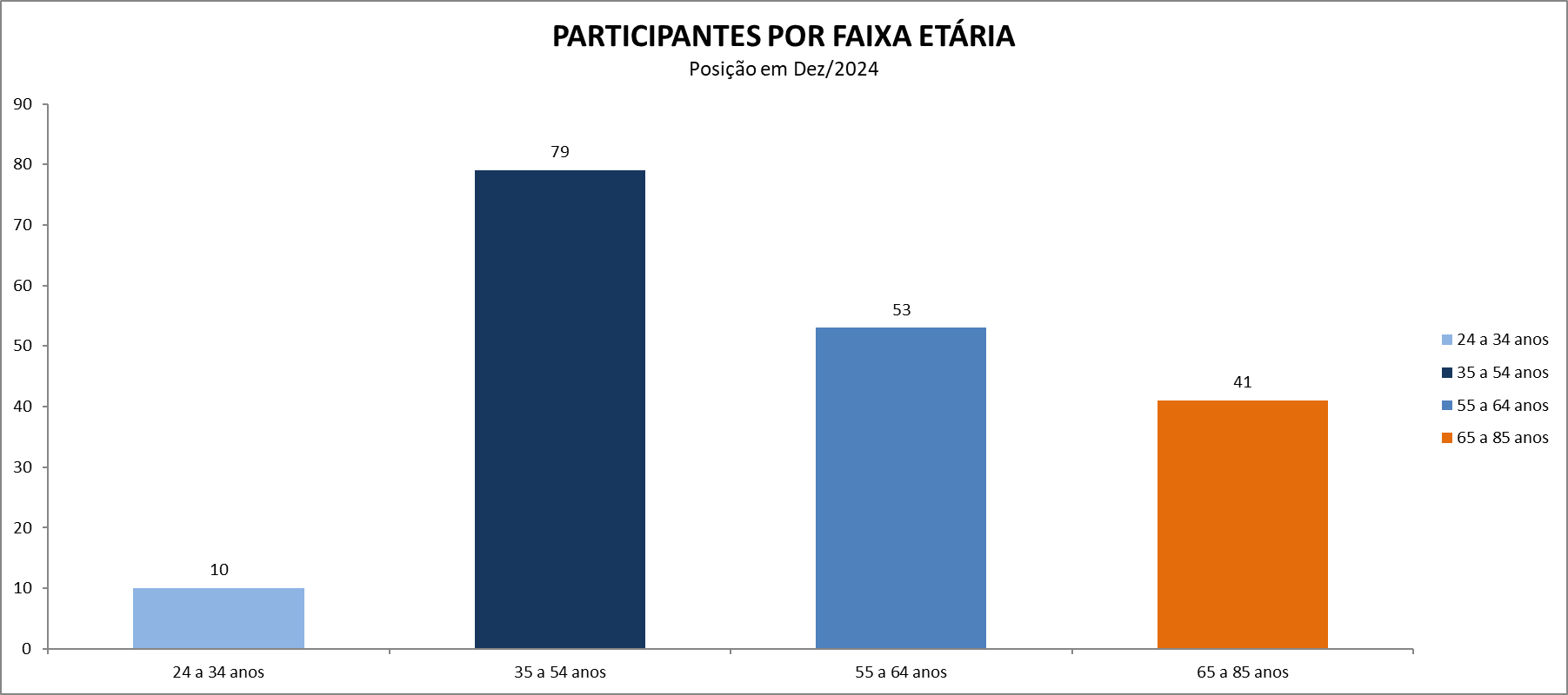 Informamos a seguir o perfil dos Participantes e Assistidos do ALEPEPREV por faixa etária e por sexo. Do total de 183 Participantes e Assistidos do Plano, podemos constatar que 5,46% encontram-se na faixa etária de 24 a 34 anos, 43,17% estão na faixa etária de 35 a 54 anos, 28,97% na faixa etária de 55 a 64 anos e 22,40% na faixa etária de 65 a 85 anos.
