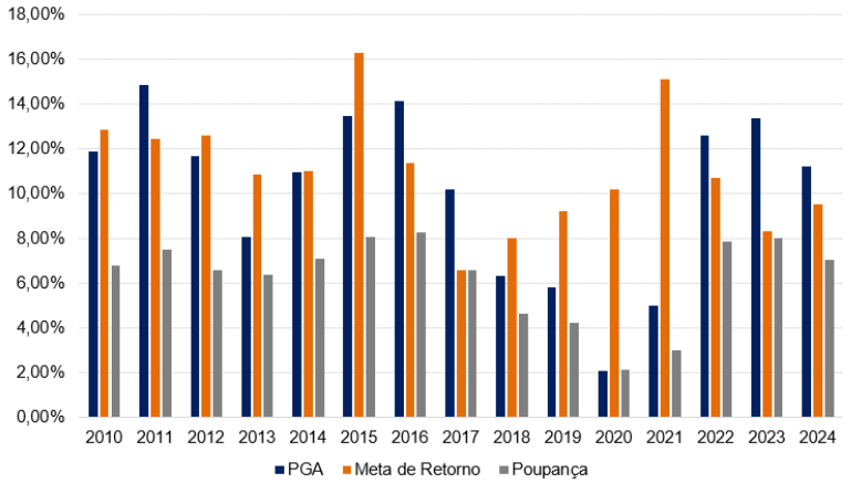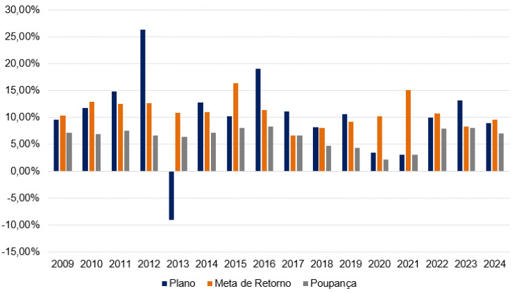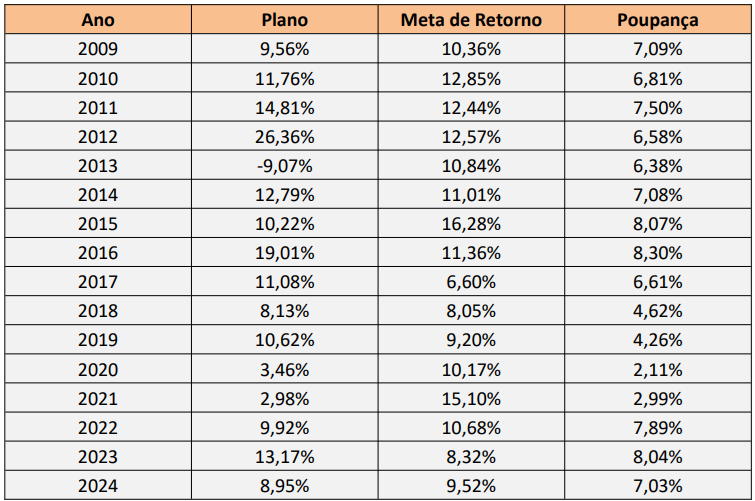 O Plano de Benefícios do ALEPEPREV obteve em 2024 um retorno de 8,95%, contra 10,87% da taxa CDI e 7,03% da Poupança, não conseguiu superar a sua meta de investimentos definida pela Política de Investimentos (INPC + 4,5% ao ano) cujo resultado foi de 9,52%.