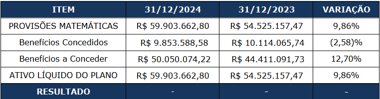 As Provisões Matemáticas do Plano totalizaram a importância de R$ 59.903.662,80, sendo compostas de R$ 50.050.074,22, relativo às Provisões Matemáticas de Benefícios a Conceder, e por R$ 9.853.588,58, referente às Provisões Matemáticas de Benefícios Concedidos.