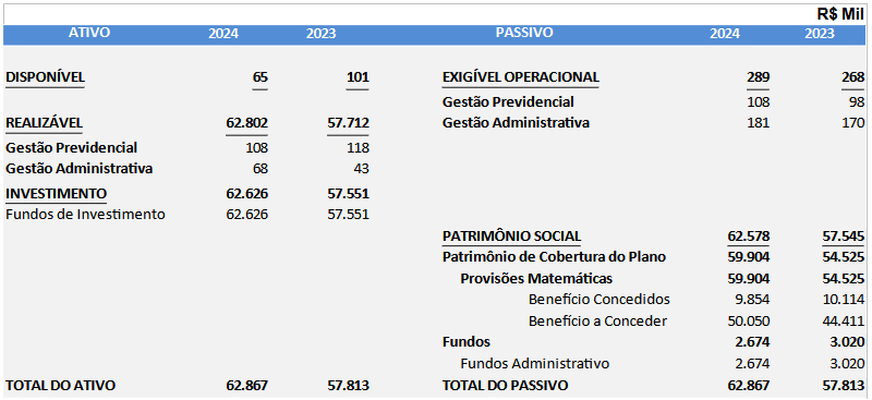 Podemos constatar, através do Balanço Patrimonial, que as obrigações atuariais e administrativas estão totalmente lastreadas pelos ativos nos exercícios sociais de 2024 e 2023: